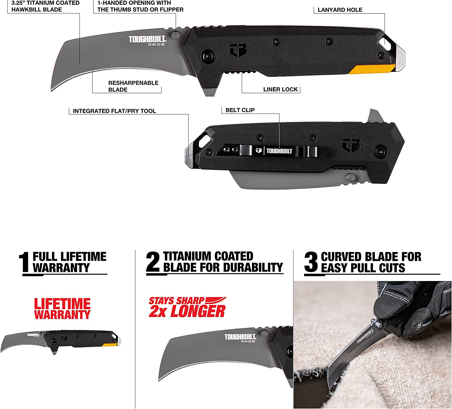 The ToughBuilt curved folding knife maximizes productivity on the job site. With the curved hook-shaped blade, it is easy to cut by pulling the knife, or to remove cable insulation. The stainless steel blade has a sharp cutting edge that can be repeatedly sharpened. This durable knife meets the strict requirements of professionals.