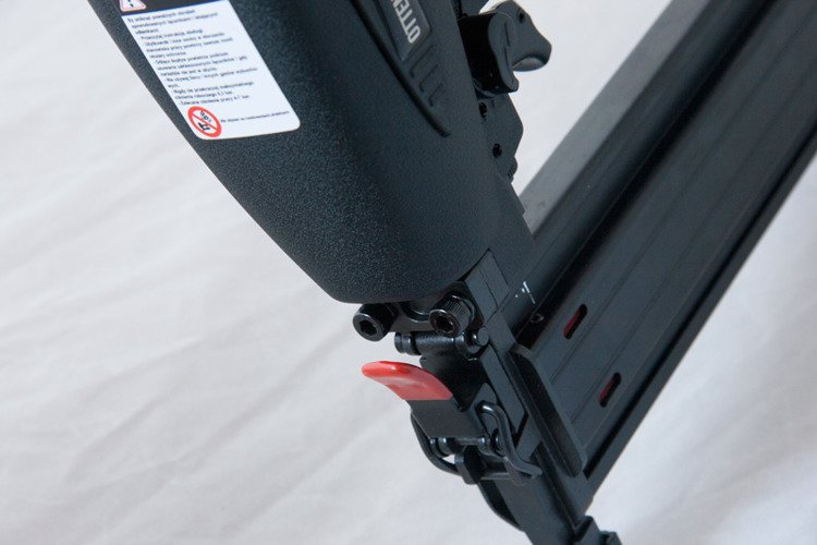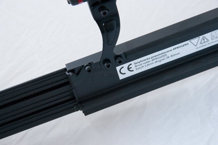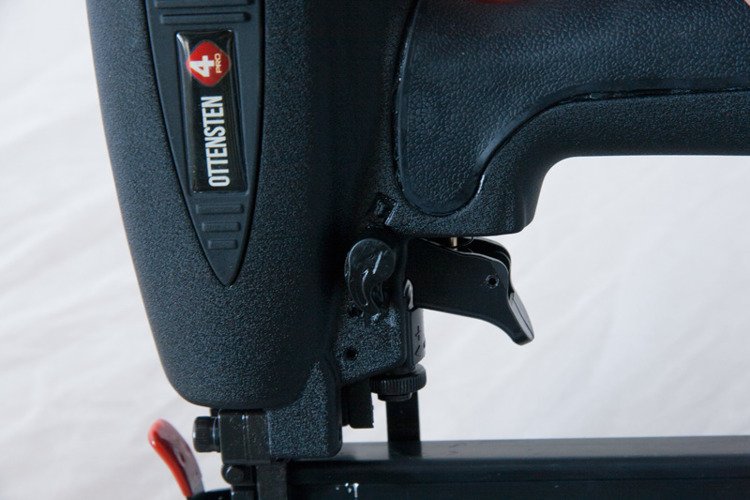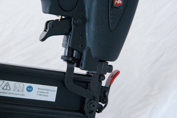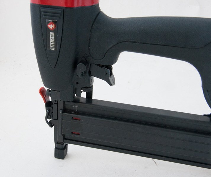 The 4PRO1450 pneumatic nailer is designed for nailing nails with a diameter of 1.2 mm and a length of 15-50 mm. The aluminum cast body is sturdy and lightweight. The tool has a depth adjustment mechanism. The design allows for quick and easy removal of stuck nails.