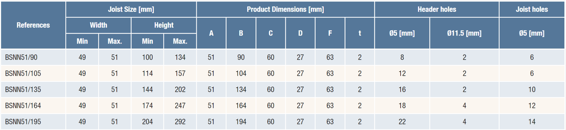 Galvanized steel 20 µm CE and ETA certified construction hardware with second service class. The BSNN series consists of robust beam hangers designed for applications requiring additional strength. BSNN beam hangers are secured using CNA nails, but they also feature 12 mm screw holes for fasteners. The depth of the beam hanger must be at least 2/3 of the height of the beam being secured to prevent rotation, unless additional reinforcement is provided at the top of the load-bearing element to restrict movement.