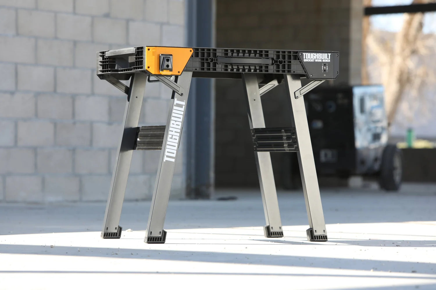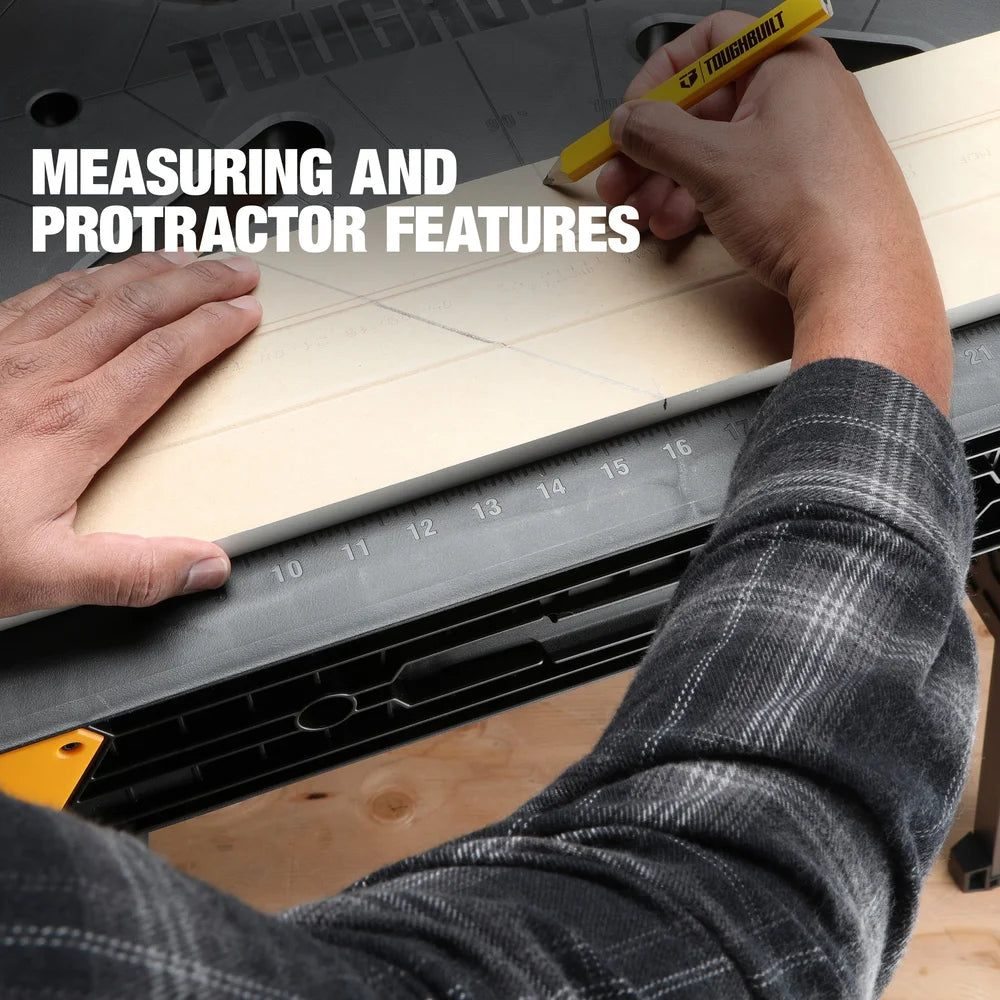 The ToughBuilt TB-WB700 Folding Workbench delivers a sturdy, professional work surface that sets up in seconds wherever the job takes you. Just press the release button and pull the handle upward to deploy the legs and create a large, stable platform. Its rugged metal legs support up to 450 kg of evenly distributed load, making it ideal for cutting, drilling, fastening, assembly, and more.